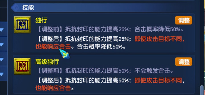 最后是神狗的技能改动,独行由原来的不合击,改成即使攻击目标不同,也能响应合击了。这条就是让神狗几乎每回合都能出手两次,正常出手一次,合击出手一次,算是加强了。